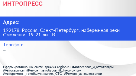 ИНТРОПРЕСС по адресу 199178, Россия, Санкт-Петербург, набережная реки Смоленки, 19-21 лит В в дальнейшем Организация, размещена в следующих категориях: