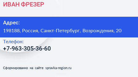 ИВАН/ФРЕЗЕР по адресу 198188, Россия, Санкт-Петербург, Возрождения, 20 в дальнейшем Организация, размещена в следующих категориях:
