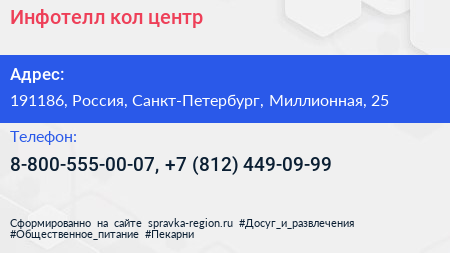 Инфотелл, кол-центр по адресу 191186, Россия, Санкт-Петербург, Миллионная, 25 в дальнейшем Организация, размещена в следующих категориях: