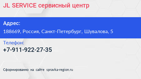 JL-SERVICE, сервисный центр по адресу 188669, Россия, Санкт-Петербург, Шувалова, 5 в дальнейшем Организация, размещена в следующих категориях: