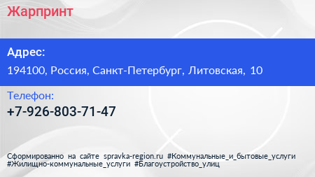 Жарпринт по адресу 194100, Россия, Санкт-Петербург, Литовская, 10 в дальнейшем Организация, размещена в следующих категориях: