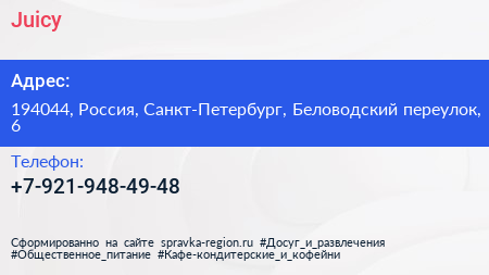 Juicy по адресу 194044, Россия, Санкт-Петербург, Беловодский переулок, 6 в дальнейшем Организация, размещена в следующих категориях: