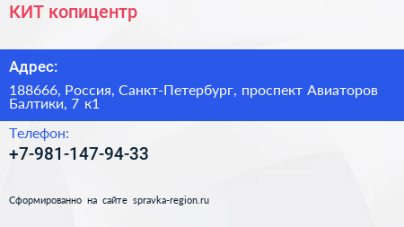 КИТ, копицентр по адресу 188666, Россия, Санкт-Петербург, проспект Авиаторов Балтики, 7 к1 в дальнейшем Организация, размещена в следующих категориях: