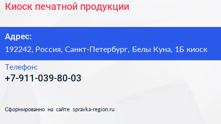 Киоск печатной продукции по адресу 192242, Россия, Санкт-Петербург, Белы Куна, 1Б киоск в дальнейшем Организация, размещена в следующих категориях: