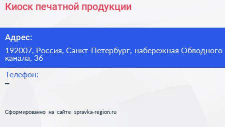 Киоск печатной продукции по адресу 192007, Россия, Санкт-Петербург, набережная Обводного канала, 36 в дальнейшем Организация, размещена в следующих категориях: