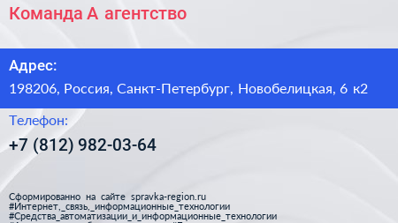 Команда-А, агентство по адресу 198206, Россия, Санкт-Петербург, Новобелицкая, 6 к2 в дальнейшем Организация, размещена в следующих категориях: