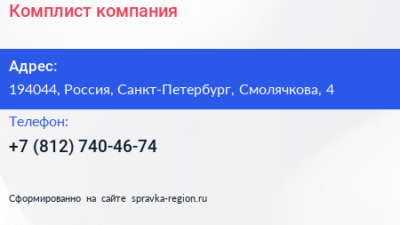 Комплист, компания по адресу 194044, Россия, Санкт-Петербург, Смолячкова, 4 в дальнейшем Организация, размещена в следующих категориях: