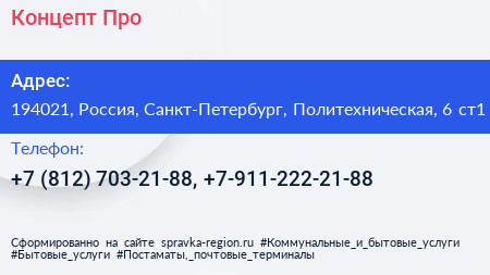 Концепт Про по адресу 194021, Россия, Санкт-Петербург, Политехническая, 6 ст1 в дальнейшем Организация, размещена в следующих категориях:
