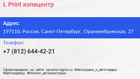 L-Print, копицентр по адресу 197110, Россия, Санкт-Петербург, Ораниенбаумская, 27 в дальнейшем Организация, размещена в следующих категориях: