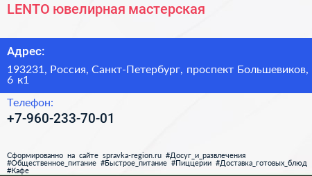 LENTO, ювелирная мастерская по адресу 193231, Россия, Санкт-Петербург, проспект Большевиков, 6 к1 в дальнейшем Организация, размещена в следующих категориях: