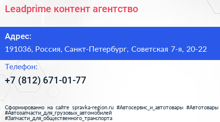 Leadprime, контент-агентство по адресу 191036, Россия, Санкт-Петербург, Советская 7-я, 20-22 в дальнейшем Организация, размещена в следующих категориях: