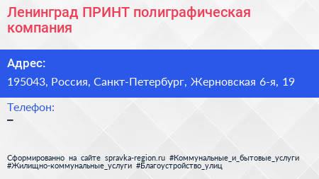 Ленинград ПРИНТ, полиграфическая компания по адресу 195043, Россия, Санкт-Петербург, Жерновская 6-я, 19 в дальнейшем Организация, размещена в следующих категориях: