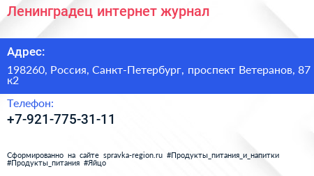 Ленинградец, интернет-журнал по адресу 198260, Россия, Санкт-Петербург, проспект Ветеранов, 87 к2 в дальнейшем Организация, размещена в следующих категориях: