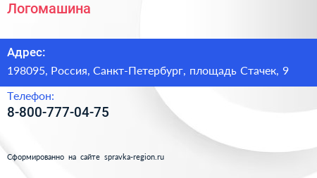 Логомашина по адресу 198095, Россия, Санкт-Петербург, площадь Стачек, 9 в дальнейшем Организация, размещена в следующих категориях: