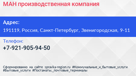 МАН, производственная компания по адресу 191119, Россия, Санкт-Петербург, Звенигородская, 9-11 в дальнейшем Организация, размещена в следующих категориях: