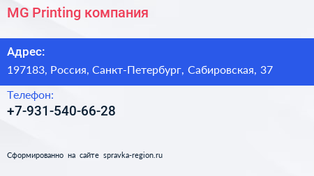 MG Printing, компания по адресу 197183, Россия, Санкт-Петербург, Сабировская, 37 в дальнейшем Организация, размещена в следующих категориях: