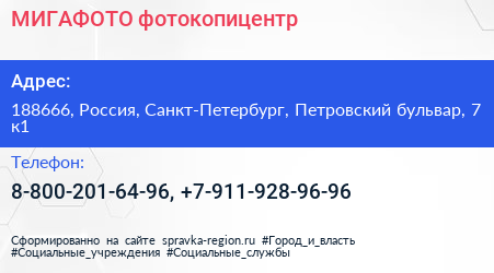МИГАФОТО, фотокопицентр по адресу 188666, Россия, Санкт-Петербург, Петровский бульвар, 7 к1 в дальнейшем Организация, размещена в следующих категориях: