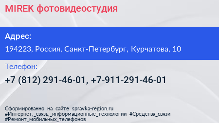 MIREK, фотовидеостудия по адресу 194223, Россия, Санкт-Петербург, Курчатова, 10 в дальнейшем Организация, размещена в следующих категориях: