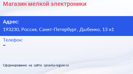 Магазин мелкой электроники по адресу 193230, Россия, Санкт-Петербург, Дыбенко, 13 к1 в дальнейшем Организация, размещена в следующих категориях: