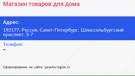 Магазин товаров для дома по адресу 192177, Россия, Санкт-Петербург, Шлиссельбургский проспект, 3-7 в дальнейшем Организация, размещена в следующих категориях:
