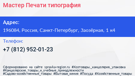 Мастер Печати, типография по адресу 196084, Россия, Санкт-Петербург, Заозёрная, 1 к4 в дальнейшем Организация, размещена в следующих категориях: