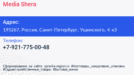 Media Shera по адресу 195267, Россия, Санкт-Петербург, Ушинского, 4 к3 в дальнейшем Организация, размещена в следующих категориях: