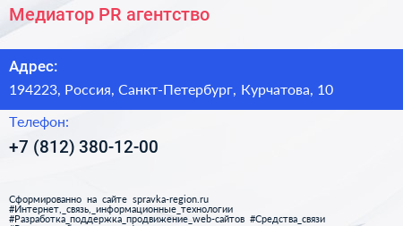 Медиатор, PR-агентство по адресу 194223, Россия, Санкт-Петербург, Курчатова, 10 в дальнейшем Организация, размещена в следующих категориях: