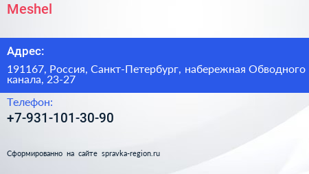 Meshel по адресу 191167, Россия, Санкт-Петербург, набережная Обводного канала, 23-27 в дальнейшем Организация, размещена в следующих категориях: