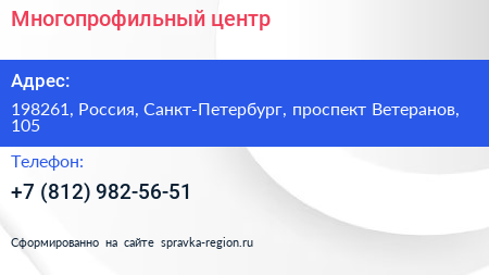 Многопрофильный центр по адресу 198261, Россия, Санкт-Петербург, проспект Ветеранов, 105 в дальнейшем Организация, размещена в следующих категориях: