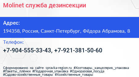 Molinet, служба дезинсекции по адресу 194358, Россия, Санкт-Петербург, Фёдора Абрамова, 8 в дальнейшем Организация, размещена в следующих категориях:
