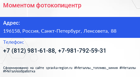 Моментом, фотокопицентр по адресу 196158, Россия, Санкт-Петербург, Ленсовета, 88 в дальнейшем Организация, размещена в следующих категориях: