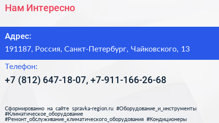 Для связи с организацией воспользуйтесь номером телефона: +7 (812) 647-18-07, +7-911-166-26-68. Пн: c 11:00-18:00, Вт: c 11:00-18:00, Ср: c 11:00-18:00, Чт: c 11:00-18:00, Пт: c 11:00-18:00, Сб: выходной, Вс: выходной, вы можете обратиться в эту организацию.