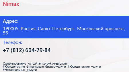 Nimax по адресу 190005, Россия, Санкт-Петербург, Московский проспект, 55 в дальнейшем Организация, размещена в следующих категориях: