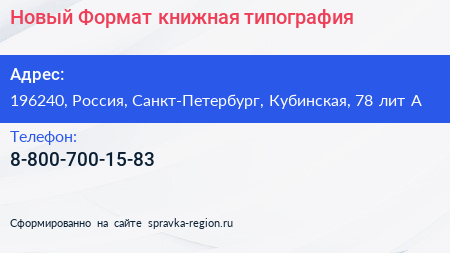 Новый Формат, книжная типография по адресу 196240, Россия, Санкт-Петербург, Кубинская, 78 лит А в дальнейшем Организация, размещена в следующих категориях: