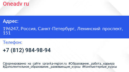 Оneadv.ru по адресу 196247, Россия, Санкт-Петербург, Ленинский проспект, 151 в дальнейшем Организация, размещена в следующих категориях: