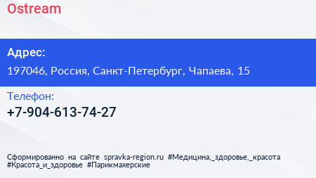 Ostream по адресу 197046, Россия, Санкт-Петербург, Чапаева, 15 в дальнейшем Организация, размещена в следующих категориях: