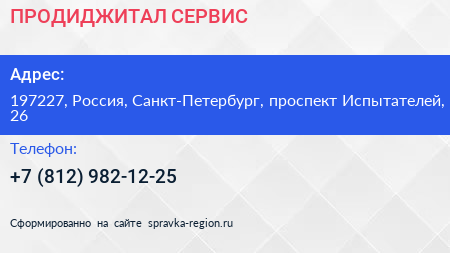 ПРОДИДЖИТАЛ СЕРВИС по адресу 197227, Россия, Санкт-Петербург, проспект Испытателей, 26 в дальнейшем Организация, размещена в следующих категориях: