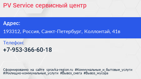 PV-Service, сервисный центр по адресу 193312, Россия, Санкт-Петербург, Коллонтай, 41в в дальнейшем Организация, размещена в следующих категориях: