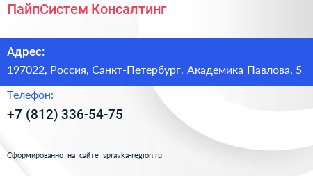 ПайпСистем Консалтинг по адресу 197022, Россия, Санкт-Петербург, Академика Павлова, 5 в дальнейшем Организация, размещена в следующих категориях: