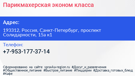 Парикмахерская эконом-класса по адресу 193312, Россия, Санкт-Петербург, проспект Солидарности, 15а к1 в дальнейшем Организация, размещена в следующих категориях: