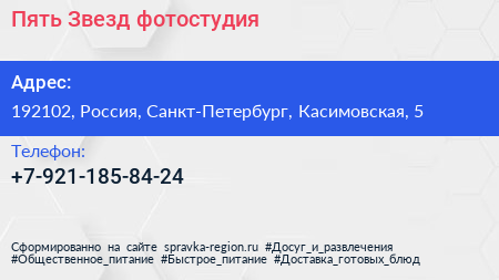 Пять Звезд, фотостудия по адресу 192102, Россия, Санкт-Петербург, Касимовская, 5 в дальнейшем Организация, размещена в следующих категориях: