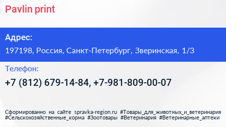 Pavlin print по адресу 197198, Россия, Санкт-Петербург, Зверинская, 1/3 в дальнейшем Организация, размещена в следующих категориях: