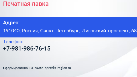 Печатная лавка по адресу 191040, Россия, Санкт-Петербург, Лиговский проспект, 68 в дальнейшем Организация, размещена в следующих категориях: