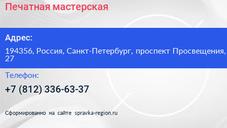 Печатная мастерская по адресу 194356, Россия, Санкт-Петербург, проспект Просвещения, 27 в дальнейшем Организация, размещена в следующих категориях: