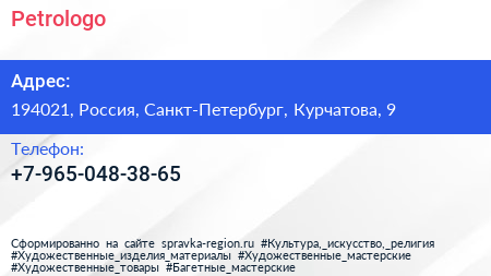 Petrologo по адресу 194021, Россия, Санкт-Петербург, Курчатова, 9 в дальнейшем Организация, размещена в следующих категориях: