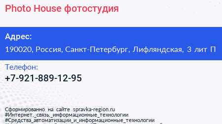 Photo House, фотостудия по адресу 190020, Россия, Санкт-Петербург, Лифляндская, 3 лит П в дальнейшем Организация, размещена в следующих категориях: