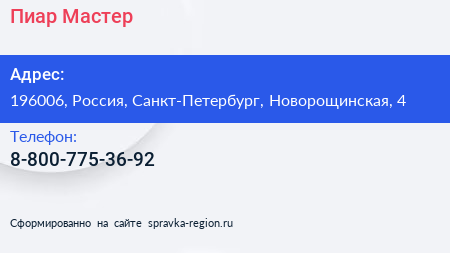 Пиар Мастер по адресу 196006, Россия, Санкт-Петербург, Новорощинская, 4 в дальнейшем Организация, размещена в следующих категориях: