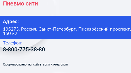 Пневмо-сити по адресу 195273, Россия, Санкт-Петербург, Пискарёвский проспект, 150 к2 в дальнейшем Организация, размещена в следующих категориях: