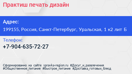 Практиш печать & дизайн по адресу 199155, Россия, Санкт-Петербург, Уральская, 1 к2 лит Б в дальнейшем Организация, размещена в следующих категориях:
