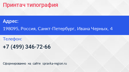 Принтач, типография по адресу 198095, Россия, Санкт-Петербург, Ивана Черных, 4 в дальнейшем Организация, размещена в следующих категориях: